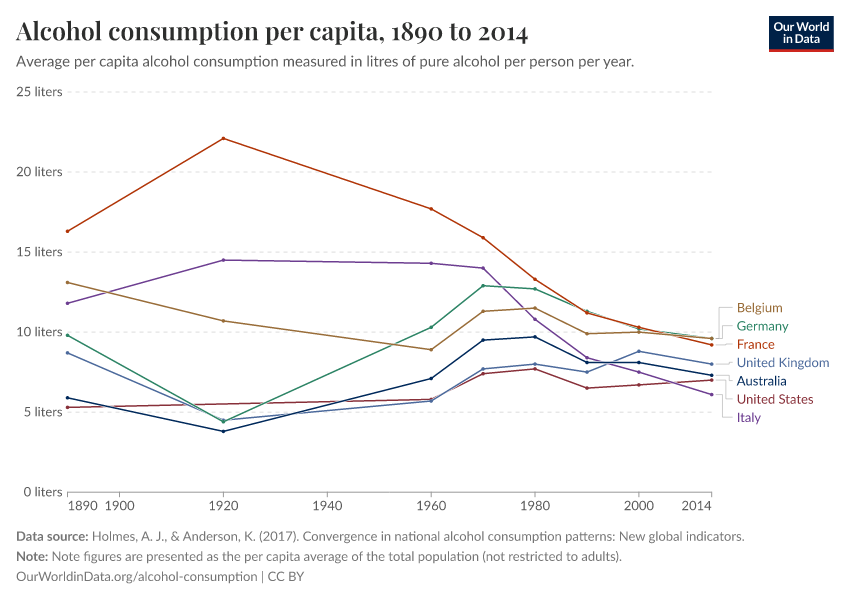 A century ago, some countries had much higher levels of alcohol consumption. In France in the 1920s, the average was 22.1 liters of pure alcohol per person per year. This equals 184 one-liter wine bottles per person per year.2 Note that in contrast to the modern statistics that are expressed in alcohol consumption per person older than 15 years, this includes children as well – the average alcohol consumption per adult was, therefore, even higher.