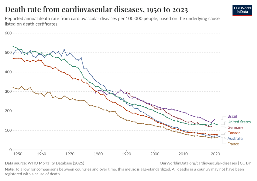 Saloni Dattani (2025) - “Death rates from cardiovascular disease have fallen dramatically — what were the breakthroughs behind this?” Published online at OurWorldinData.org. Retrieved from: 'https://enhance-catalog-improvements.owid.pages.dev:8789/20260119-084543/cardiovascular-deaths-decline.html' [Online Resource] (archived on January 19, 2026).BibTeX citation