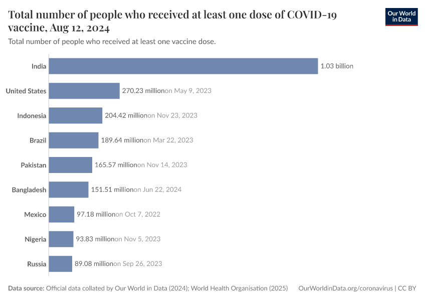 The following charts show the total number of people who have received at least one dose of the COVID-19 vaccine. This may not be equivalent to the number with a complete initial protocol if the vaccine requires two doses.