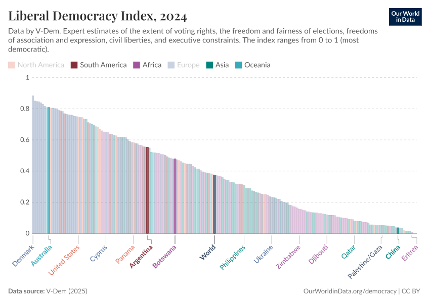 The source we show here is the electoral democracy index from the Varieties of Democracy (V-Dem) project1. In our Democracy Data Explorer, however, we show the data for several leading approaches, so that you can compare how different sources score democracy across the world.