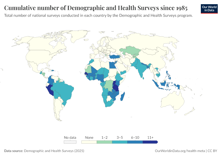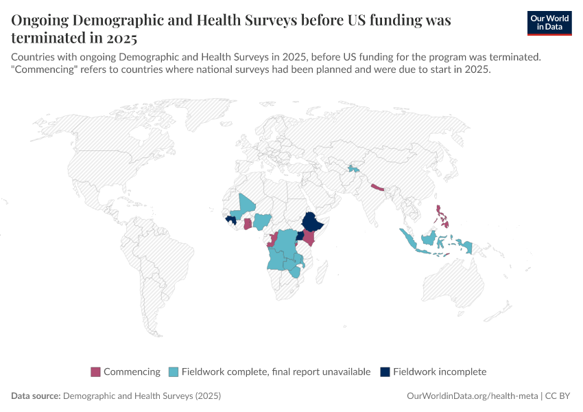 Saloni Dattani (2025) - “The Demographic and Health Surveys brought crucial data for more than 90 countries — without them, we risk darkness” Published online at OurWorldinData.org. Retrieved from: 'https://enhance-catalog-improvements.owid.pages.dev:8789/20260224-080822/demographic-health-surveys-risk.html' [Online Resource] (archived on February 24, 2026).BibTeX citation