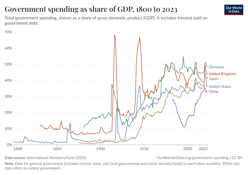 At the end of the 19th century, governments in European countries spent around 10% of their GDP. In the 21st century, this figure is closer to 50% in many European countries. The increase in absolute terms — rather than the shown relative terms — is much larger since the level of GDP per capita increased substantially over this period.