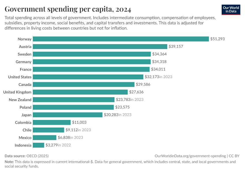 The chart shows total public spending per person across all levels of government in OECD countries.