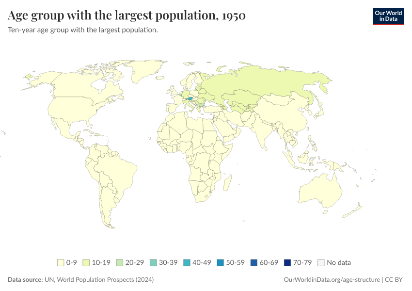 “Data Page: Ten year age-group with the highest population”. Our World in Data (2026). Data adapted from United Nations. Retrieved from https://enhance-catalog-improvements.owid.pages.dev:8789/20251002-121819/grapher/age-group-with-the-largest-population.html [online resource] (archived on October 2, 2025).How to cite this data