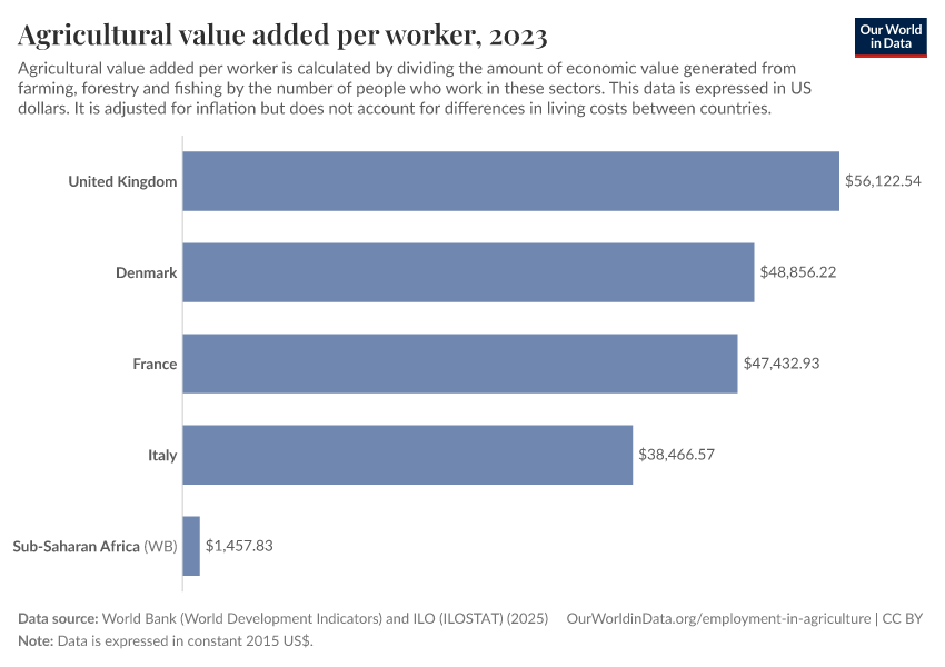 “Data Page: Agricultural value added per worker”. Our World in Data (2026). Data adapted from World Bank (World Development Indicators) and ILO (ILOSTAT). Retrieved from https://enhance-catalog-improvements.owid.pages.dev:8789/20260129-125221/grapher/agriculture-value-added-per-worker-wdi.html [online resource] (archived on January 29, 2026).How to cite this data