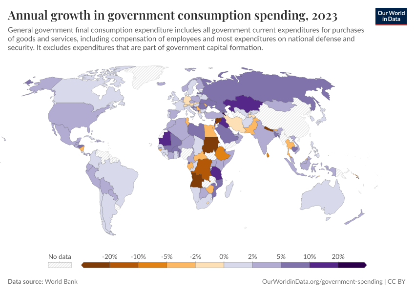 “Data Page: Annual growth in government consumption spending”. Our World in Data (2026). Data adapted from World Bank. Retrieved from https://enhance-catalog-improvements.owid.pages.dev:8789/20260130-180113/grapher/annual-growth-of-general-government-final-consumption-expenditure.html [online resource] (archived on January 30, 2026).How to cite this data