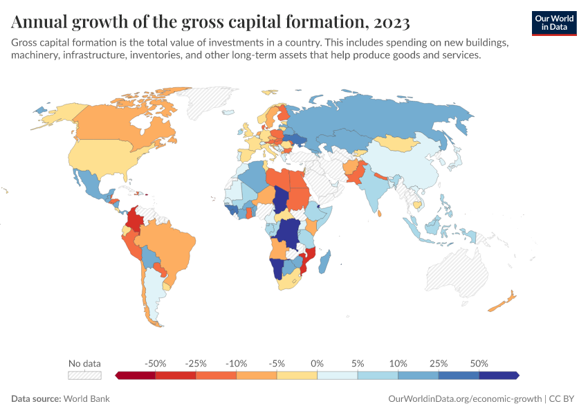 World Bank – processed by Our World in Data. “Annual growth of the gross capital formation” [dataset]. World Bank, “World Bank national accounts data, and OECD National Accounts data files.” [original data]. Retrieved February 24, 2026 from https://enhance-catalog-improvements.owid.pages.dev:8789/20260130-180113/grapher/annual-growth-of-the-gross-capital-formation.html (archived on January 30, 2026).