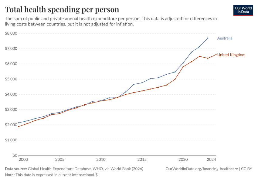 “Data Page: Total health spending per person”. Our World in Data (2026). Data adapted from Global Health Expenditure Database, WHO, via World Bank. Retrieved from https://enhance-catalog-improvements.owid.pages.dev:8789/20260202-180243/grapher/annual-healthcare-expenditure-per-capita.html [online resource] (archived on February 2, 2026).