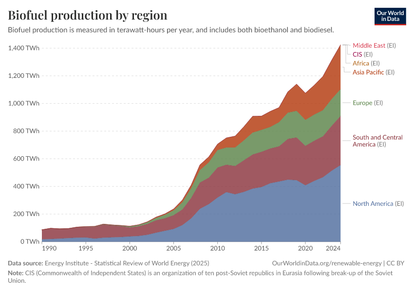Energy Institute - Statistical Review of World Energy (2025) – with major processing by Our World in Data. “Biofuels production” [dataset]. Energy Institute, “Statistical Review of World Energy” [original data]. Retrieved February 24, 2026 from https://enhance-catalog-improvements.owid.pages.dev:8789/20260119-065148/grapher/biofuels-production-by-region.html (archived on January 19, 2026).