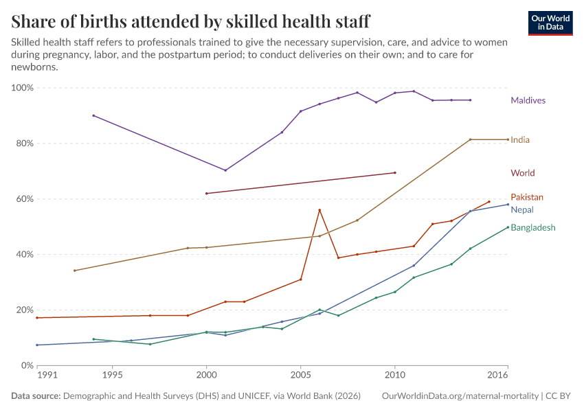 Demographic and Health Surveys (DHS) and UNICEF, via World Bank (2026) – processed by Our World in Data. “Share of births attended by skilled health staff” [dataset]. Demographic and Health Surveys (DHS) and UNICEF, via World Bank, “World Development Indicators 125” [original data]. Retrieved February 24, 2026 from https://enhance-catalog-improvements.owid.pages.dev:8789/20260202-181317/grapher/births-attended-by-health-staff-sdgs.html (archived on February 2, 2026).