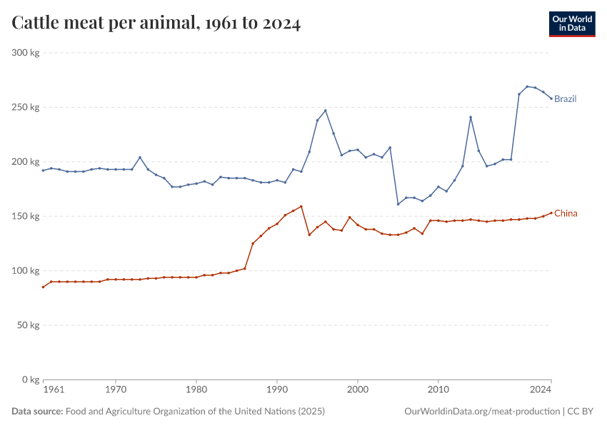 Food and Agriculture Organization of the United Nations (2025) – with major processing by Our World in Data. “Cattle meat yield per animal – UN FAO” [dataset]. Food and Agriculture Organization of the United Nations, “Production: Crops and livestock products” [original data]. Retrieved February 24, 2026 from https://enhance-catalog-improvements.owid.pages.dev:8789/20260116-143329/grapher/cattle-meat-yields-hectograms-100-grams-per-animal.html (archived on January 16, 2026).