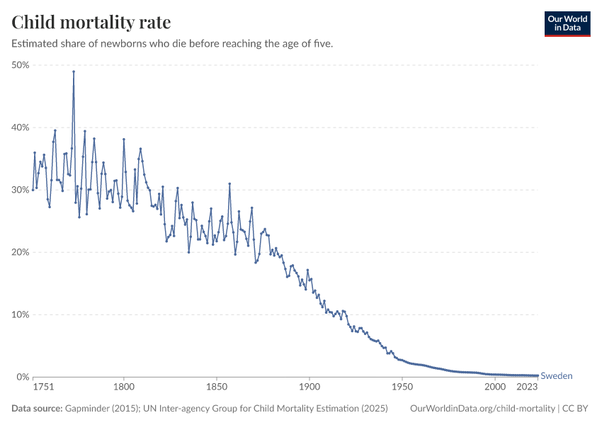 Gapminder (2015); UN Inter-agency Group for Child Mortality Estimation (2025) – processed by Our World in Data. “Child mortality rate – Gapminder; UN IGME – Long-run data” [dataset]. United Nations Inter-agency Group for Child Mortality Estimation, “United Nations Inter-agency Group for Child Mortality Estimation”; Gapminder, “Child mortality rate under age five v7”; Gapminder based on UN IGME & UN WPP, “Under-five Mortality v11”; Various sources, “Population” [original data]. Retrieved February 24, 2026 from https://enhance-catalog-improvements.owid.pages.dev:8789/20260119-070102/grapher/child-mortality.html (archived on January 19, 2026).