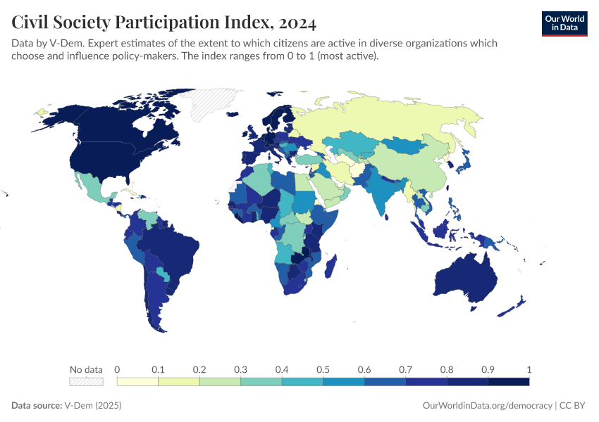 “Data Page: Civil society participation index”, part of the following publication: Bastian Herre, Lucas Rodés-Guirao, and Esteban Ortiz-Ospina (2013) - “Democracy”. Data adapted from V-Dem. Retrieved from https://enhance-catalog-improvements.owid.pages.dev:8789/20260119-070102/grapher/civil-society-participation-index.html [online resource] (archived on January 19, 2026).How to cite this data