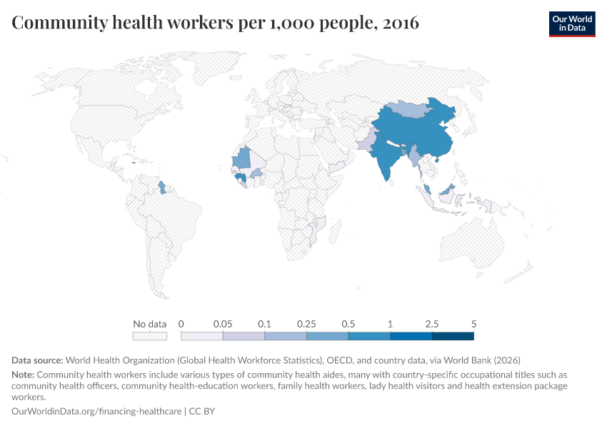 “Data Page: Community health workers per 1,000 people”. Our World in Data (2026). Data adapted from World Health Organization (Global Health Workforce Statistics), OECD, and country data, via World Bank. Retrieved from https://enhance-catalog-improvements.owid.pages.dev:8789/20260202-181317/grapher/community-health-workers.html [online resource] (archived on February 2, 2026).How to cite this data