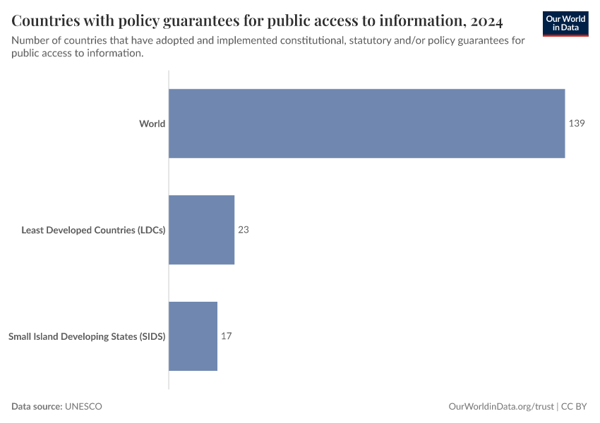 “Data Page: Countries with policy guarantees for public access to information”. Our World in Data (2026). Data adapted from UNESCO. Retrieved from https://enhance-catalog-improvements.owid.pages.dev:8789/20260130-180113/grapher/countries-that-adopt-guarantees-for-public-access-to-information.html [online resource] (archived on January 30, 2026).How to cite this data