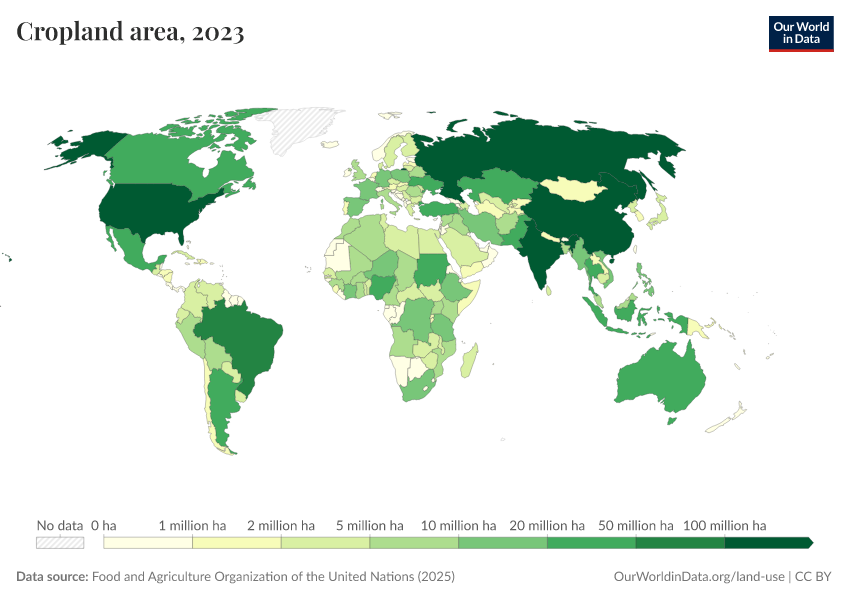 “Data Page: Cropland area”, part of the following publication: Hannah Ritchie, Pablo Rosado, and Max Roser (2023) - “Agricultural Production”. Data adapted from Food and Agriculture Organization of the United Nations. Retrieved from https://enhance-catalog-improvements.owid.pages.dev:8789/20260119-235736/grapher/cropland-area.html [online resource] (archived on January 19, 2026).How to cite this data