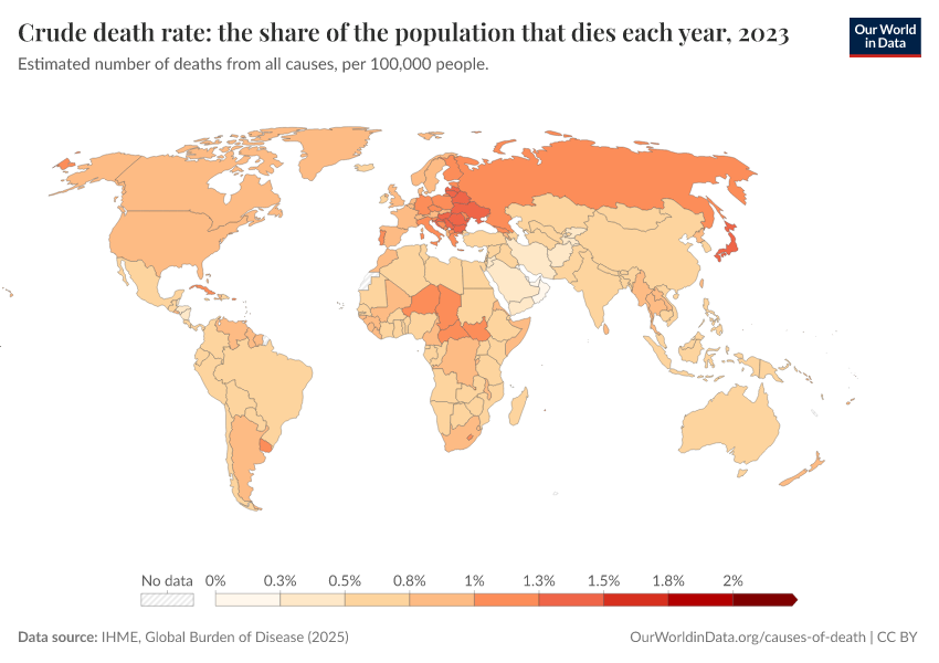 IHME, Global Burden of Disease (2025) – with major processing by Our World in Data. “Crude death rate: the share of the population that dies each year” [dataset]. IHME, Global Burden of Disease, “Global Burden of Disease - Deaths” [original data]. Retrieved February 24, 2026 from https://enhance-catalog-improvements.owid.pages.dev:8789/20260211-174736/grapher/crude-death-rate-the-share-of-the-population-that-dies-each-year-gbd.html (archived on February 11, 2026).