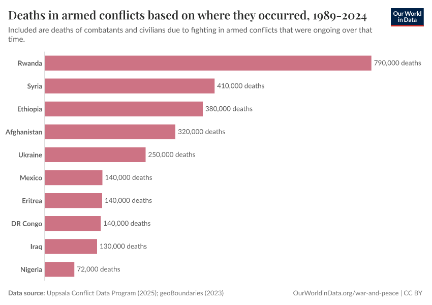 “Data Page: Deaths in armed conflicts based on where they occurred, 1989-2024”. Our World in Data (2026). Data adapted from Uppsala Conflict Data Program, Natural Earth. Retrieved from https://enhance-catalog-improvements.owid.pages.dev:8789/20250909-093708/grapher/cumulative-deaths-in-armed-conflicts.html [online resource] (archived on September 9, 2025).How to cite this data