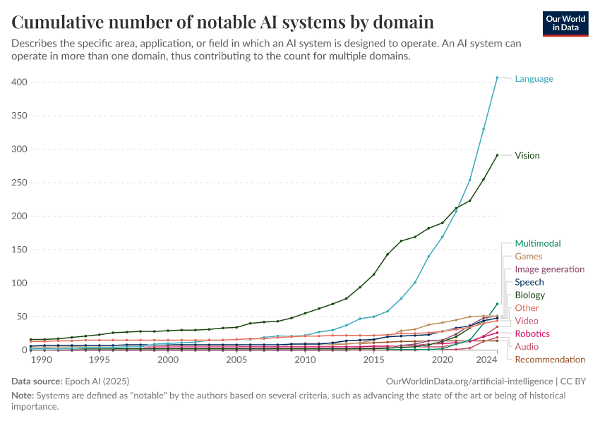 Epoch AI (2025) – with major processing by Our World in Data. “Cumulative number of notable AI systems by domain” [dataset]. Epoch AI, “Parameter, Compute and Data Trends in Machine Learning” [original data]. Retrieved February 24, 2026 from https://enhance-catalog-improvements.owid.pages.dev:8789/20260126-094752/grapher/cumulative-number-of-notable-ai-systems-by-domain.html (archived on January 26, 2026).