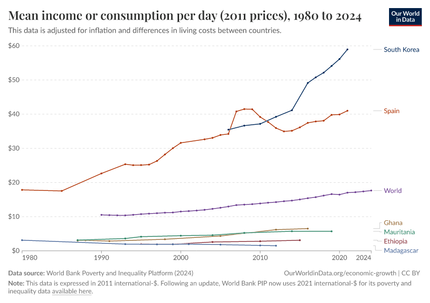 World Bank Poverty and Inequality Platform (2024) – with major processing by Our World in Data. “Mean income or consumption per day (2011 prices) – World Bank” [dataset]. World Bank Poverty and Inequality Platform, “World Bank Poverty and Inequality Platform (PIP) 20240627_2017, 20240627_2011” [original data]. Retrieved February 24, 2026 from https://enhance-catalog-improvements.owid.pages.dev:8789/20251022-091218/grapher/daily-mean-income-2011-ppp.html (archived on October 22, 2025).