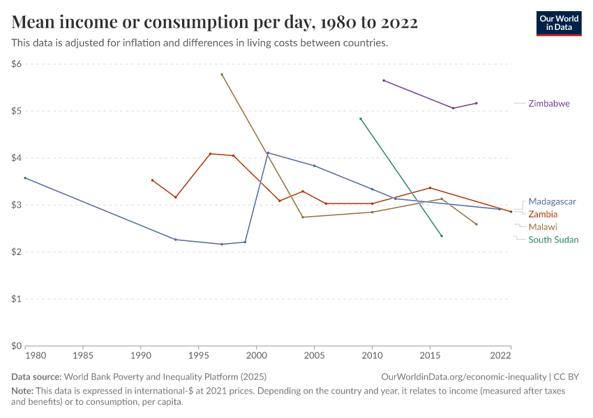 World Bank Poverty and Inequality Platform (2025) – with major processing by Our World in Data. “Mean income or consumption per day – World Bank” [dataset]. World Bank Poverty and Inequality Platform, “World Bank Poverty and Inequality Platform (PIP) 20250930_2021, 20250930_2017” [original data]. Retrieved February 24, 2026 from https://enhance-catalog-improvements.owid.pages.dev:8789/20260127-114142/grapher/daily-mean-income.html (archived on January 27, 2026).