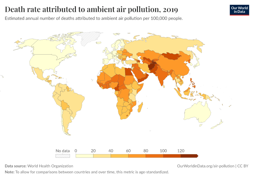 World Health Organization – processed by Our World in Data. “Death rate attributed to ambient air pollution” [dataset]. World Health Organization, “Global Health Observatory (GHO), World Health Organisation (WHO)” [original data]. Retrieved February 24, 2026 from https://enhance-catalog-improvements.owid.pages.dev:8789/20260130-180113/grapher/death-rate-ambient-air-pollution.html (archived on January 30, 2026).