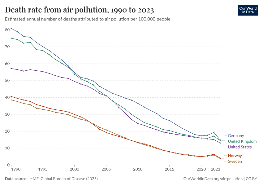 IHME, Global Burden of Disease (2025) – with major processing by Our World in Data. “Death rate from air pollution” [dataset]. IHME, Global Burden of Disease, “Global Burden of Disease - Risk Factors - Deaths” [original data]. Retrieved February 24, 2026 from https://enhance-catalog-improvements.owid.pages.dev:8789/20260213-112438/grapher/death-rate-from-air-pollution-per-100000.html (archived on February 13, 2026).