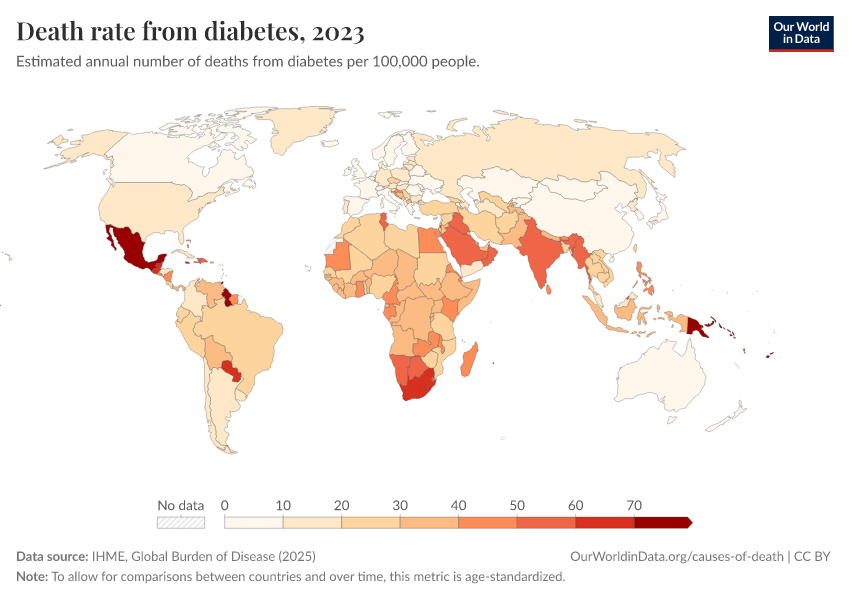 “Data Page: Death rate from diabetes”, part of the following publication: Esteban Ortiz-Ospina and Max Roser (2016) - “Global Health”. Data adapted from IHME, Global Burden of Disease. Retrieved from https://enhance-catalog-improvements.owid.pages.dev:8789/20260211-174736/grapher/death-rate-from-diabetes.html [online resource] (archived on February 11, 2026).How to cite this data