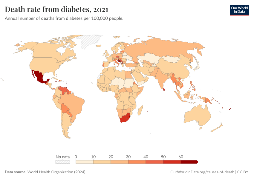 World Health Organization (2024) – with major processing by Our World in Data. “Death rate from diabetes” [dataset]. World Health Organization, “Global Health Estimates” [original data]. Retrieved February 24, 2026 from https://enhance-catalog-improvements.owid.pages.dev:8789/20250909-093708/grapher/death-rate-from-diabetes-ghe.html (archived on September 9, 2025).