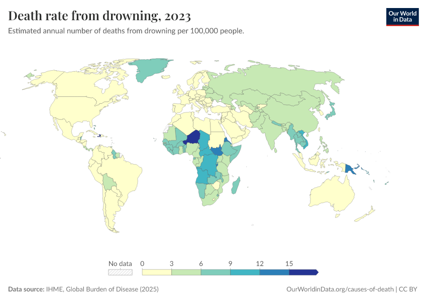 IHME, Global Burden of Disease (2025) – with major processing by Our World in Data. “Death rate from drowning” [dataset]. IHME, Global Burden of Disease, “Global Burden of Disease - Deaths” [original data]. Retrieved February 24, 2026 from https://enhance-catalog-improvements.owid.pages.dev:8789/20260211-174736/grapher/death-rate-from-drowning.html (archived on February 11, 2026).