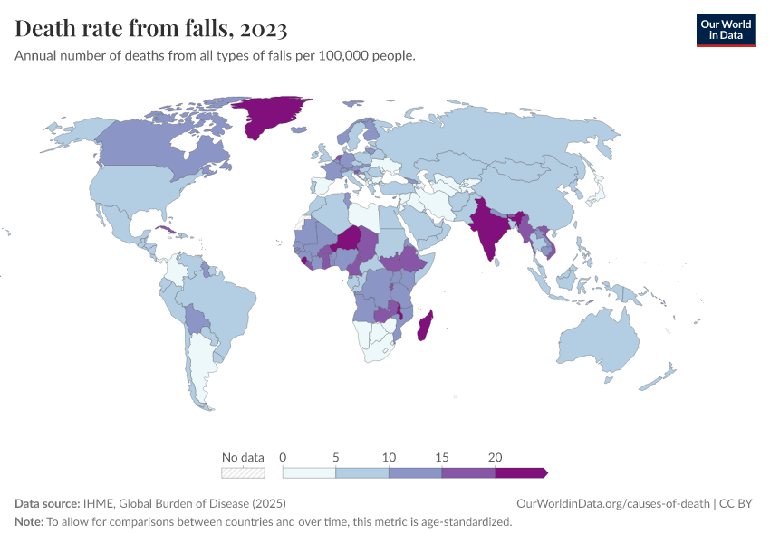 IHME, Global Burden of Disease (2025) – with major processing by Our World in Data. “Death rate from falls” [dataset]. IHME, Global Burden of Disease, “Global Burden of Disease - Deaths” [original data]. Retrieved February 24, 2026 from https://enhance-catalog-improvements.owid.pages.dev:8789/20260211-174736/grapher/death-rate-from-falls-gbd.html (archived on February 11, 2026).