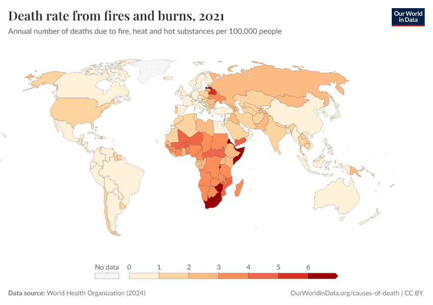 World Health Organization (2024) – with major processing by Our World in Data. “Death rate from fires and burns” [dataset]. World Health Organization, “Global Health Estimates” [original data]. Retrieved February 24, 2026 from https://enhance-catalog-improvements.owid.pages.dev:8789/20250909-093708/grapher/death-rate-from-fires-and-burns-who.html (archived on September 9, 2025).