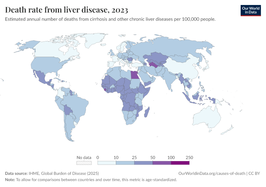 IHME, Global Burden of Disease (2025) – with major processing by Our World in Data. “Death rate from liver disease” [dataset]. IHME, Global Burden of Disease, “Global Burden of Disease - Deaths” [original data]. Retrieved February 24, 2026 from https://enhance-catalog-improvements.owid.pages.dev:8789/20260211-174736/grapher/death-rate-from-liver-disease.html (archived on February 11, 2026).