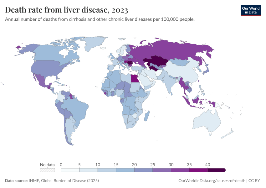 IHME, Global Burden of Disease (2025) – with major processing by Our World in Data. “Death rate from liver disease” [dataset]. IHME, Global Burden of Disease, “Global Burden of Disease - Deaths” [original data]. Retrieved February 24, 2026 from https://enhance-catalog-improvements.owid.pages.dev:8789/20260211-174736/grapher/death-rate-from-liver-disease-gbd.html (archived on February 11, 2026).