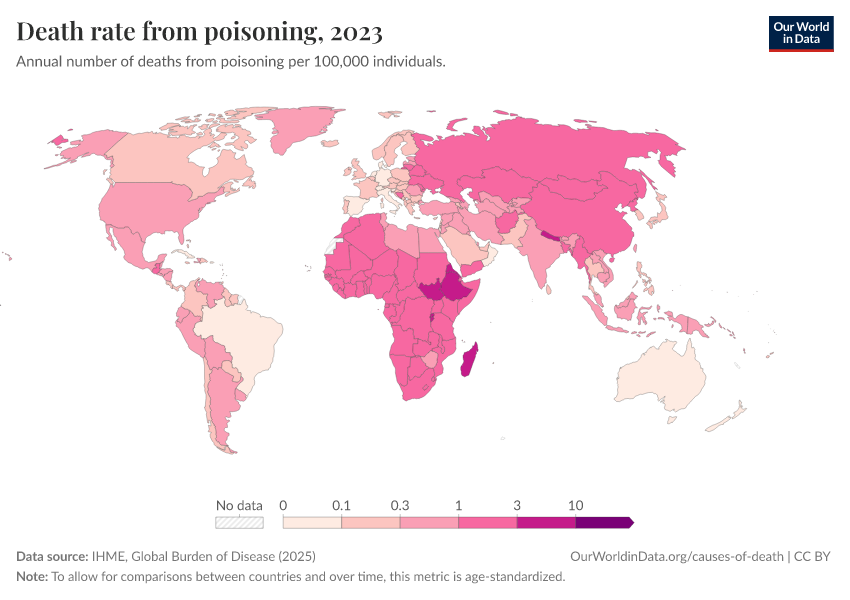 IHME, Global Burden of Disease (2025) – with major processing by Our World in Data. “Death rate from poisoning” [dataset]. IHME, Global Burden of Disease, “Global Burden of Disease - Deaths” [original data]. Retrieved February 24, 2026 from https://enhance-catalog-improvements.owid.pages.dev:8789/20260211-174736/grapher/death-rate-from-poisoning.html (archived on February 11, 2026).
