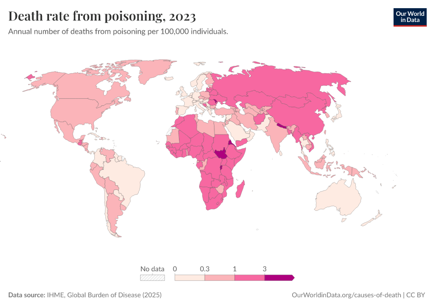 “Data Page: Death rate from poisoning”, part of the following publication: Esteban Ortiz-Ospina and Max Roser (2016) - “Global Health”. Data adapted from IHME, Global Burden of Disease. Retrieved from https://enhance-catalog-improvements.owid.pages.dev:8789/20260211-174736/grapher/death-rate-from-poisoning-gbd.html [online resource] (archived on February 11, 2026).How to cite this data