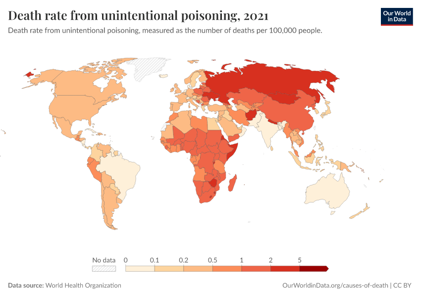 “Data Page: Death rate from unintentional poisoning”. Our World in Data (2026). Data adapted from World Health Organization. Retrieved from https://enhance-catalog-improvements.owid.pages.dev:8789/20260130-180113/grapher/death-rate-from-poisonings.html [online resource] (archived on January 30, 2026).How to cite this data
