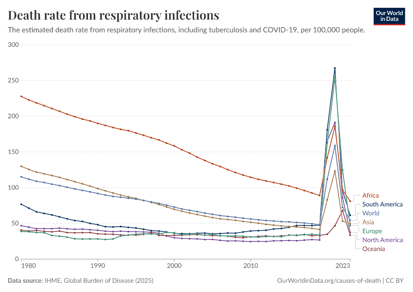 IHME, Global Burden of Disease (2025) – with major processing by Our World in Data. “Death rate from respiratory infections” [dataset]. IHME, Global Burden of Disease, “Global Burden of Disease - Deaths” [original data]. Retrieved February 24, 2026 from https://enhance-catalog-improvements.owid.pages.dev:8789/20260211-174736/grapher/death-rate-from-respiratory-infections-gbd.html (archived on February 11, 2026).