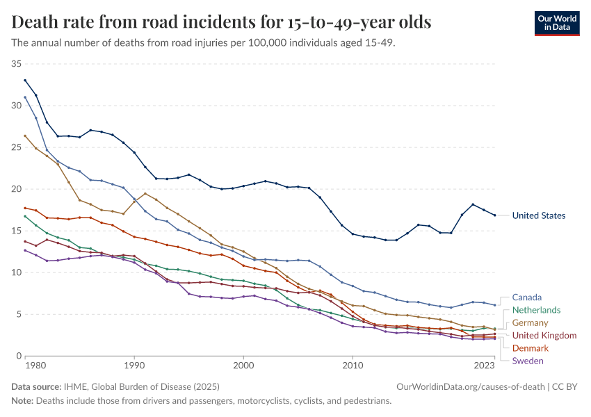 “Data Page: Death rate from road incidents for 15-to-49-year olds”, part of the following publication: Esteban Ortiz-Ospina and Max Roser (2016) - “Global Health”. Data adapted from IHME, Global Burden of Disease. Retrieved from https://enhance-catalog-improvements.owid.pages.dev:8789/20260211-174736/grapher/death-rate-from-road-accidents-for-15--to-49-year-olds.html [online resource] (archived on February 11, 2026).How to cite this data