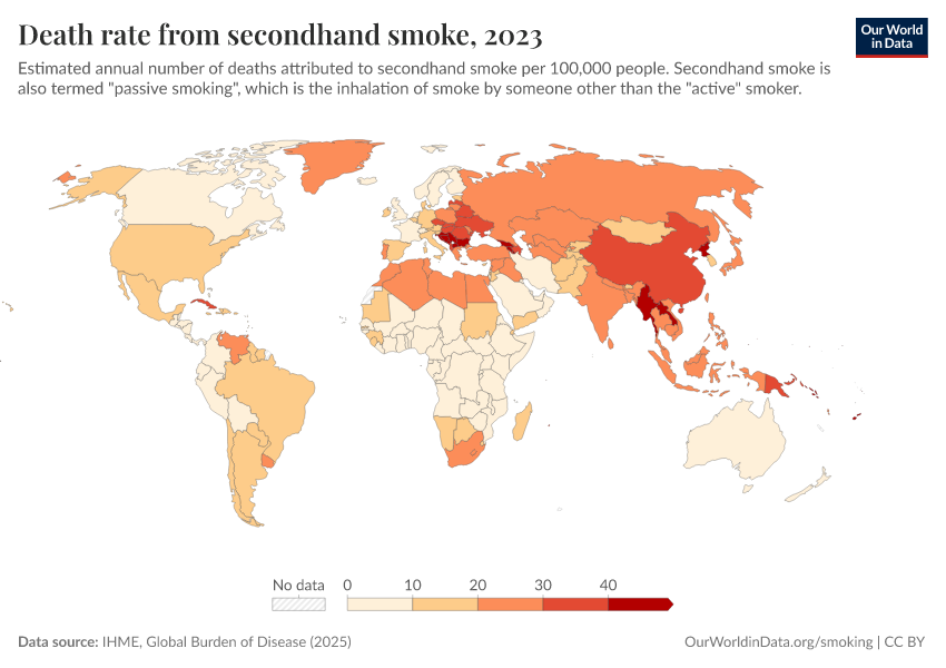 IHME, Global Burden of Disease (2025) – with major processing by Our World in Data. “Death rate from secondhand smoke” [dataset]. IHME, Global Burden of Disease, “Global Burden of Disease - Risk Factors - Deaths” [original data]. Retrieved February 24, 2026 from https://enhance-catalog-improvements.owid.pages.dev:8789/20260213-113303/grapher/death-rate-from-secondhand-smoke-gbd.html (archived on February 13, 2026).