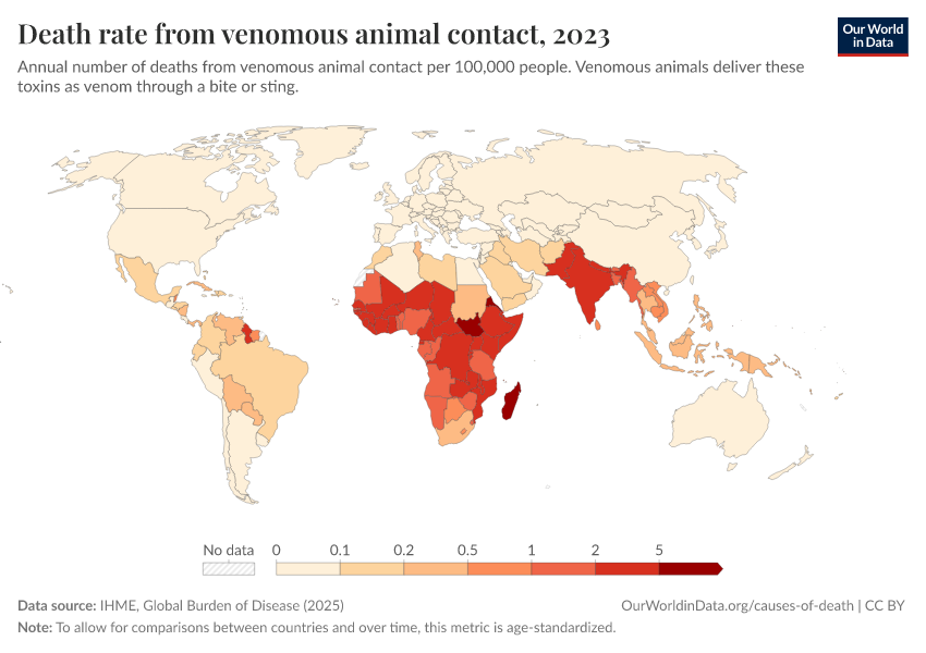 IHME, Global Burden of Disease (2025) – with major processing by Our World in Data. “Death rate from venomous animal contact” [dataset]. IHME, Global Burden of Disease, “Global Burden of Disease - Deaths” [original data]. Retrieved February 24, 2026 from https://enhance-catalog-improvements.owid.pages.dev:8789/20260211-174736/grapher/death-rate-from-venomous-animal.html (archived on February 11, 2026).