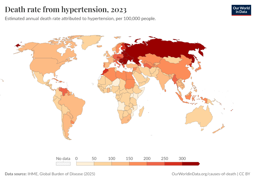 IHME, Global Burden of Disease (2025) – with major processing by Our World in Data. “Death rate from hypertension” [dataset]. IHME, Global Burden of Disease, “Global Burden of Disease - Risk Factors - Deaths” [original data]. Retrieved February 24, 2026 from https://enhance-catalog-improvements.owid.pages.dev:8789/20260213-112438/grapher/death-rates-from-high-blood-pressure-gbd.html (archived on February 13, 2026).