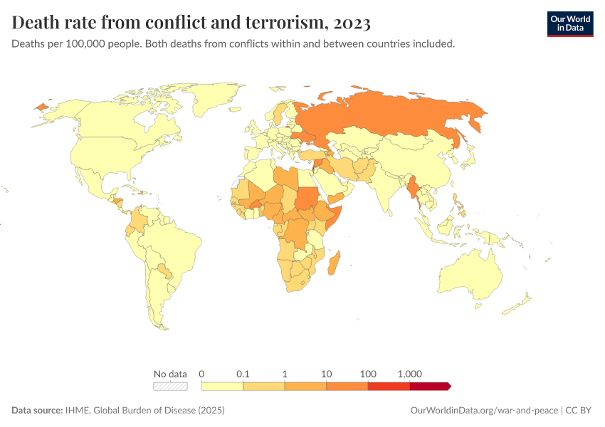 “Data Page: Death rate from conflict and terrorism”, part of the following publication: Esteban Ortiz-Ospina and Max Roser (2016) - “Global Health”. Data adapted from IHME, Global Burden of Disease. Retrieved from https://enhance-catalog-improvements.owid.pages.dev:8789/20260211-173942/grapher/deaths-conflict-terrorism-per-100000.html [online resource] (archived on February 11, 2026).How to cite this data