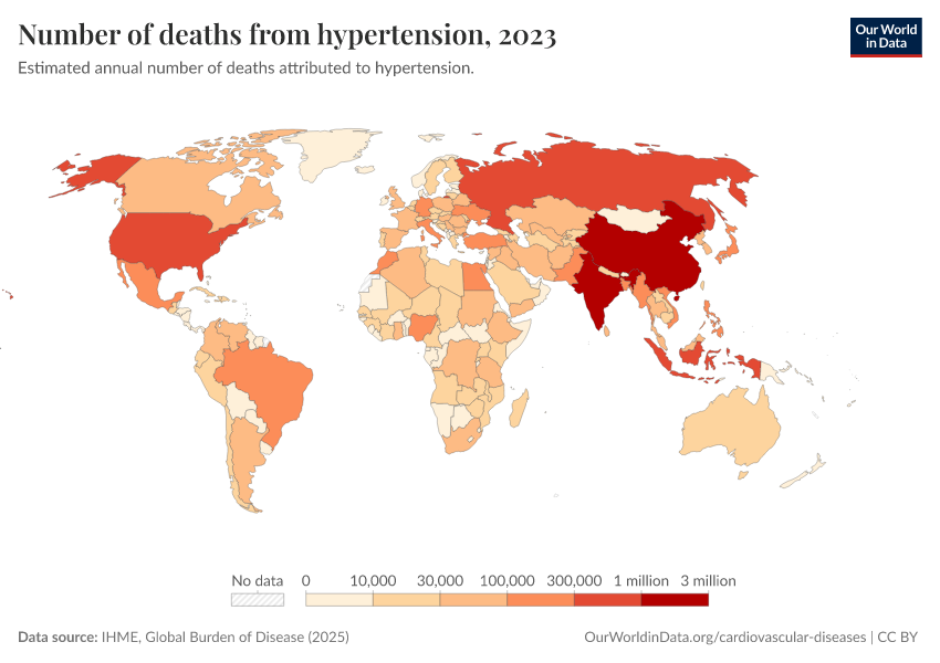 “Data Page: Number of deaths from hypertension”, part of the following publication: Esteban Ortiz-Ospina and Max Roser (2016) - “Global Health”. Data adapted from IHME, Global Burden of Disease. Retrieved from https://enhance-catalog-improvements.owid.pages.dev:8789/20260213-112438/grapher/deaths-due-to-high-blood-pressure.html [online resource] (archived on February 13, 2026).How to cite this data