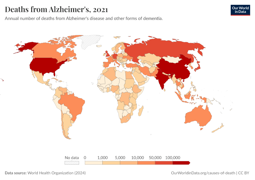 World Health Organization (2024) – with major processing by Our World in Data. “Deaths from Alzheimer's” [dataset]. World Health Organization, “Global Health Estimates” [original data]. Retrieved February 24, 2026 from https://enhance-catalog-improvements.owid.pages.dev:8789/20250909-093708/grapher/deaths-from-alzheimers-other-dementias.html (archived on September 9, 2025).