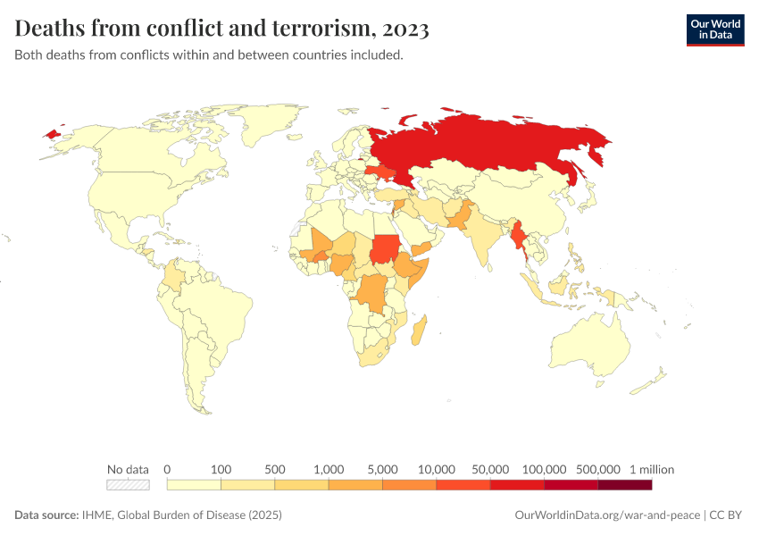 IHME, Global Burden of Disease (2025) – with major processing by Our World in Data. “Deaths from conflict and terrorism” [dataset]. IHME, Global Burden of Disease, “Global Burden of Disease - Deaths” [original data]. Retrieved February 24, 2026 from https://enhance-catalog-improvements.owid.pages.dev:8789/20260211-174736/grapher/deaths-from-conflict-and-terrorism.html (archived on February 11, 2026).