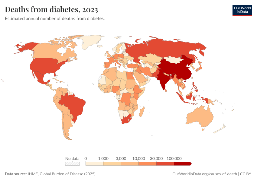 “Data Page: Deaths from diabetes”, part of the following publication: Esteban Ortiz-Ospina and Max Roser (2016) - “Global Health”. Data adapted from IHME, Global Burden of Disease. Retrieved from https://enhance-catalog-improvements.owid.pages.dev:8789/20260211-174736/grapher/deaths-from-diabetes.html [online resource] (archived on February 11, 2026).How to cite this data