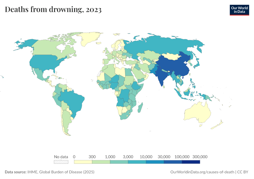 IHME, Global Burden of Disease (2025) – with major processing by Our World in Data. “Deaths from drowning” [dataset]. IHME, Global Burden of Disease, “Global Burden of Disease - Deaths” [original data]. Retrieved February 24, 2026 from https://enhance-catalog-improvements.owid.pages.dev:8789/20260211-174736/grapher/deaths-from-drowning.html (archived on February 11, 2026).