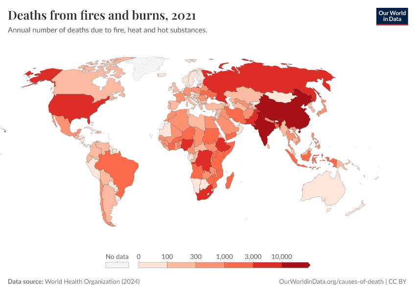 World Health Organization (2024) – with major processing by Our World in Data. “Deaths from fires and burns” [dataset]. World Health Organization, “Global Health Estimates” [original data]. Retrieved February 24, 2026 from https://enhance-catalog-improvements.owid.pages.dev:8789/20250909-093708/grapher/deaths-from-fires-and-burns-who.html (archived on September 9, 2025).