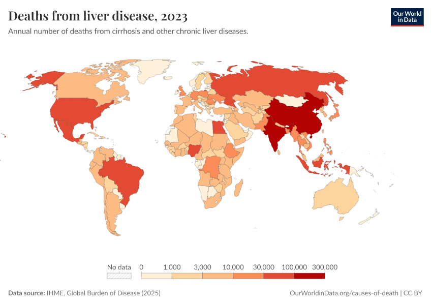 IHME, Global Burden of Disease (2025) – with major processing by Our World in Data. “Deaths from liver disease” [dataset]. IHME, Global Burden of Disease, “Global Burden of Disease - Deaths” [original data]. Retrieved February 24, 2026 from https://enhance-catalog-improvements.owid.pages.dev:8789/20260211-174736/grapher/deaths-from-liver-disease.html (archived on February 11, 2026).